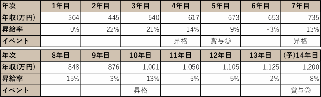 ・7年目に2度目の昇格で700万円、10年目に3度目の昇格で1,000万円を突破。