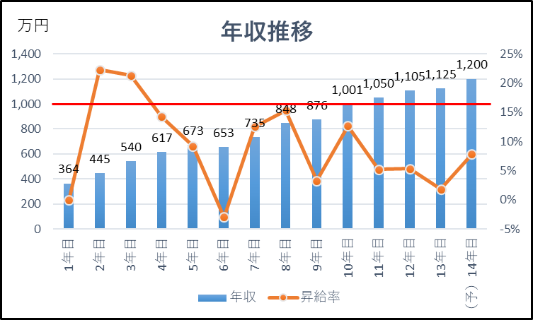 ・私は、3年目で世間の男性平均を超過し、13年目で約2倍の年収となっています。