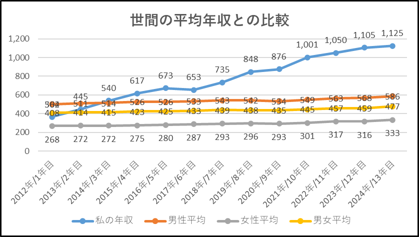 ・直近の2024年/13年目は、男性平均が586万円に対し、私の給与は1,125万円であり、その差は約2倍でした。
